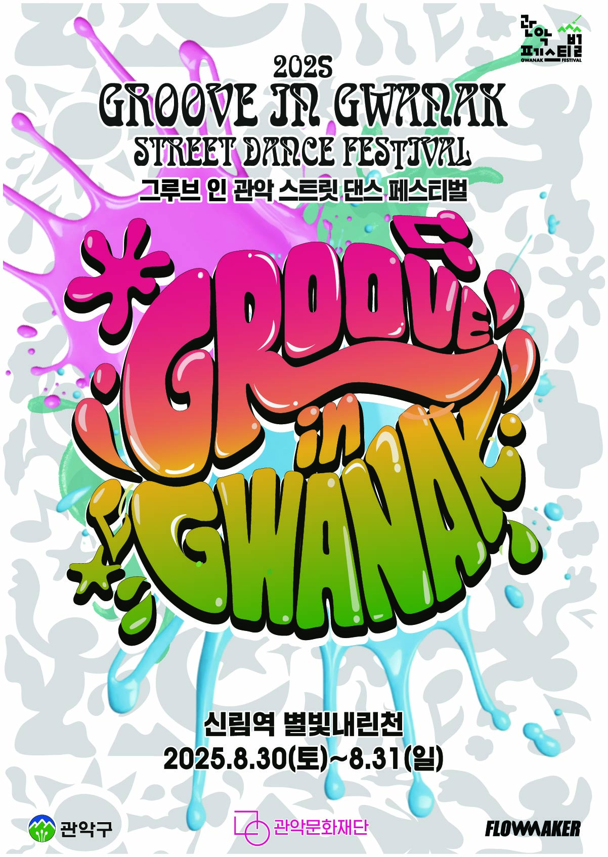 '2025 그루브 인 관악'은 팝핑(Popping), 락킹(Locking), 왁킹(Waacking), 브레이킹(Breaking), 하우스(House), 크럼프(Krump) 등 모든 장르의 스트리트 댄서와 함께 관악구 특성화 장소(신림 별빛내린천)에서 펼쳐지는 글로벌 스트리트 댄스 페스티벌입니다.