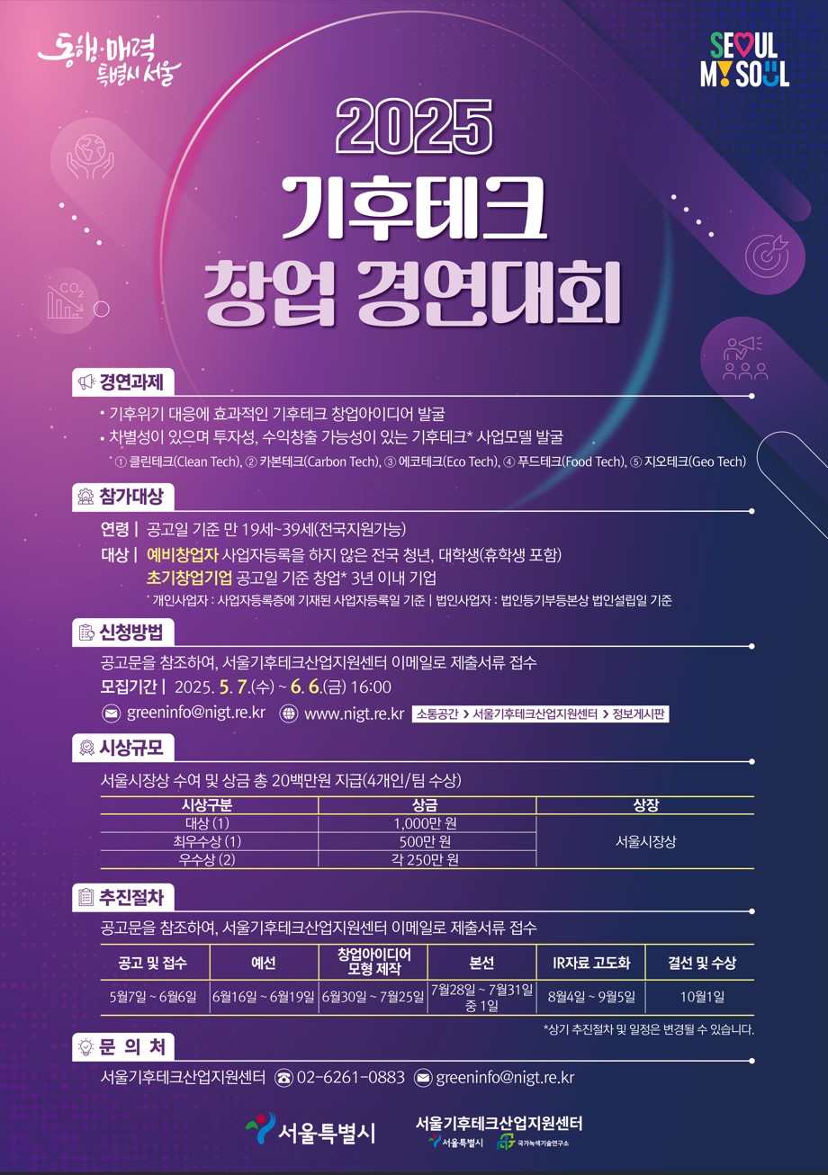 서울특별시는 청년 예비창업자 및 기업가의 기후테크 창업아이디어, 사업모델 등을 발굴하고자 ‘2025 기후테크 창업 경연대회’를 다음과 같이 개최하오니 많은 참여바랍니다.